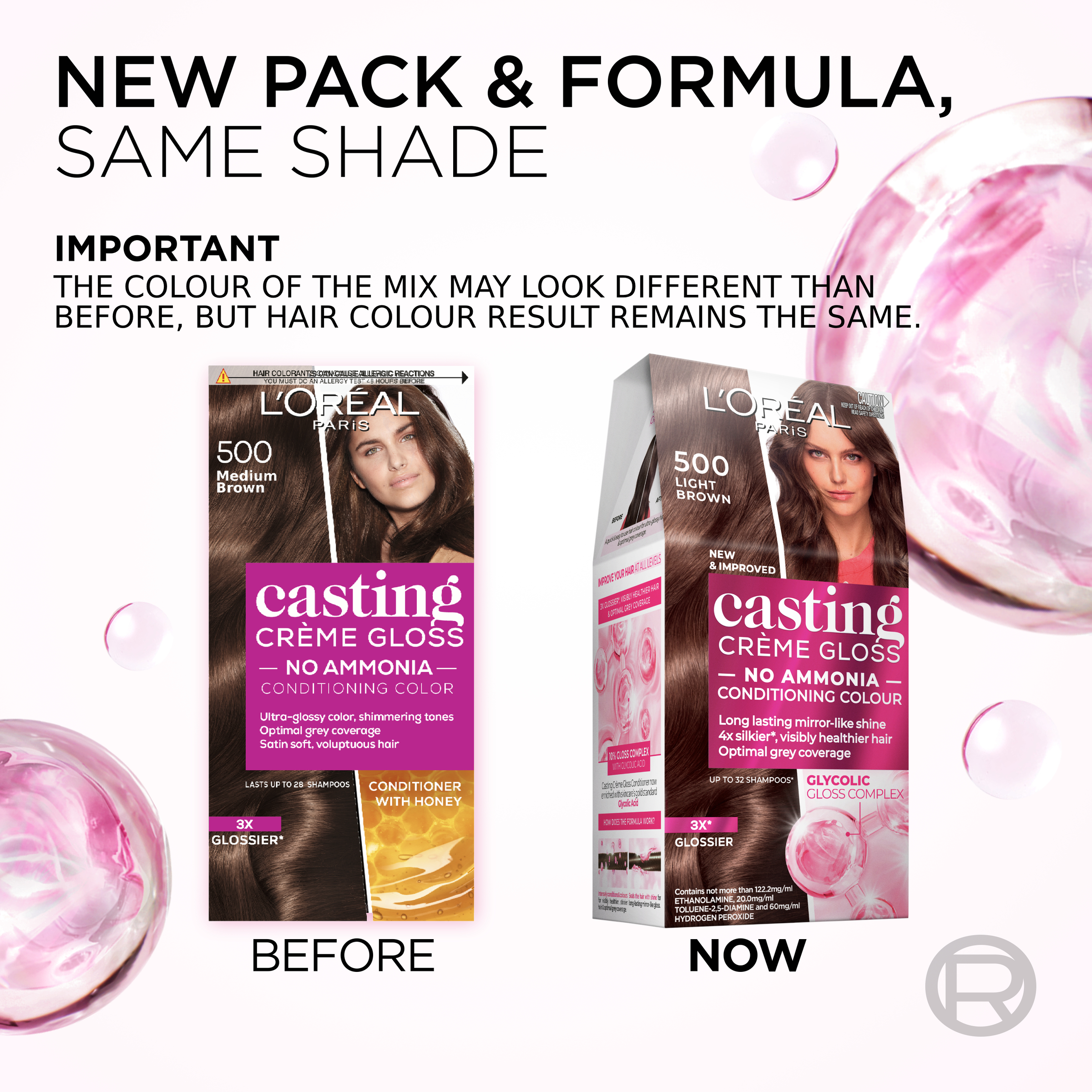 L'Oréal Paris Casting Crème Gloss now enriched with our [Glycolic] Gloss Complex for an ultra-glossy long-lasting colour, visibly healthier hair and flawless grey coverage. Gloss now lasts through 32 washes*.