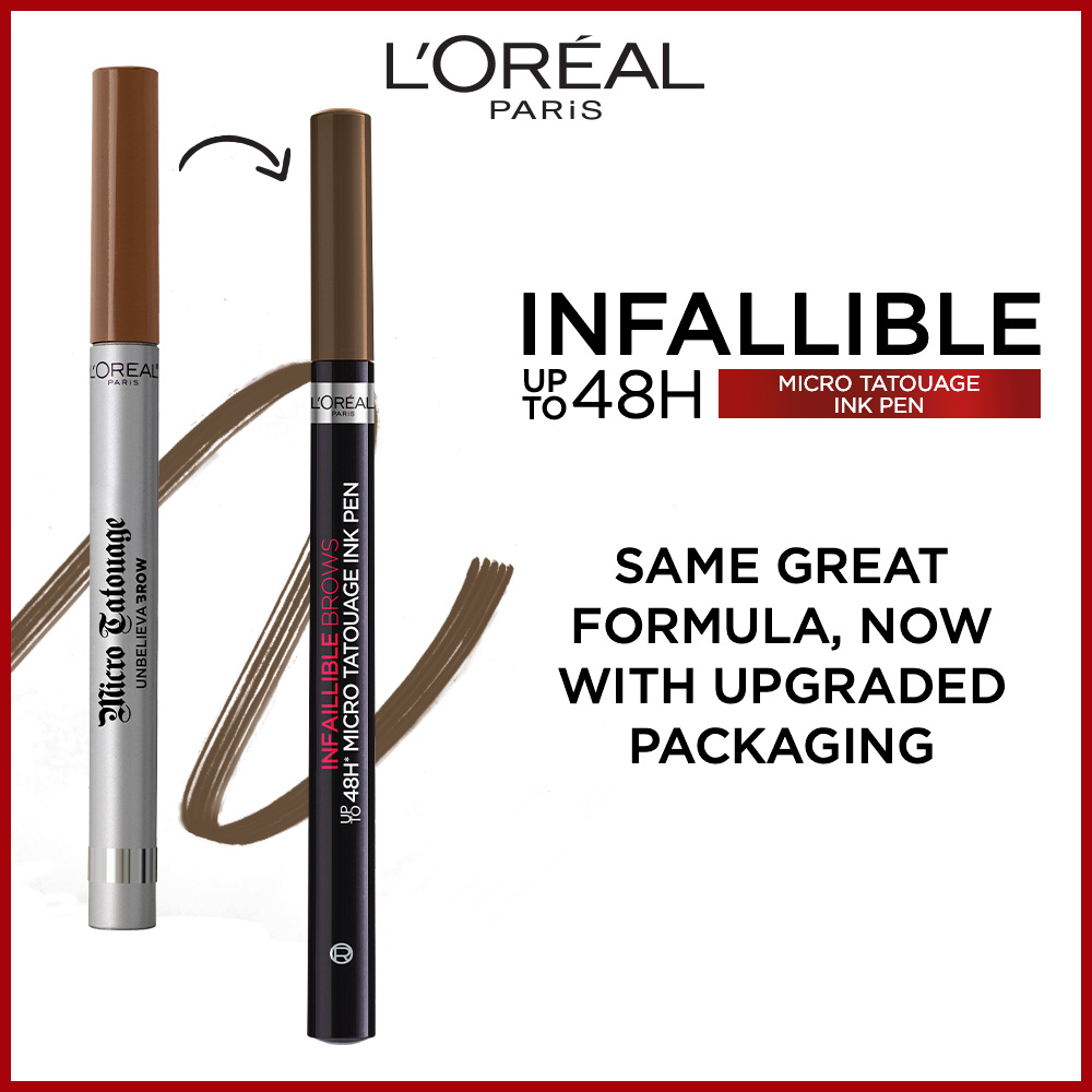 The L'Oreal Paris Infallible 48H Micro Tatouage Ink Pen offers 5 easy-to-match shades for a naturally tattooed brow look. The ergonomic slanted applicator and the pigmented formula provides a better flow and no more dry out. Up to 48H hold with no colour fadeout.
