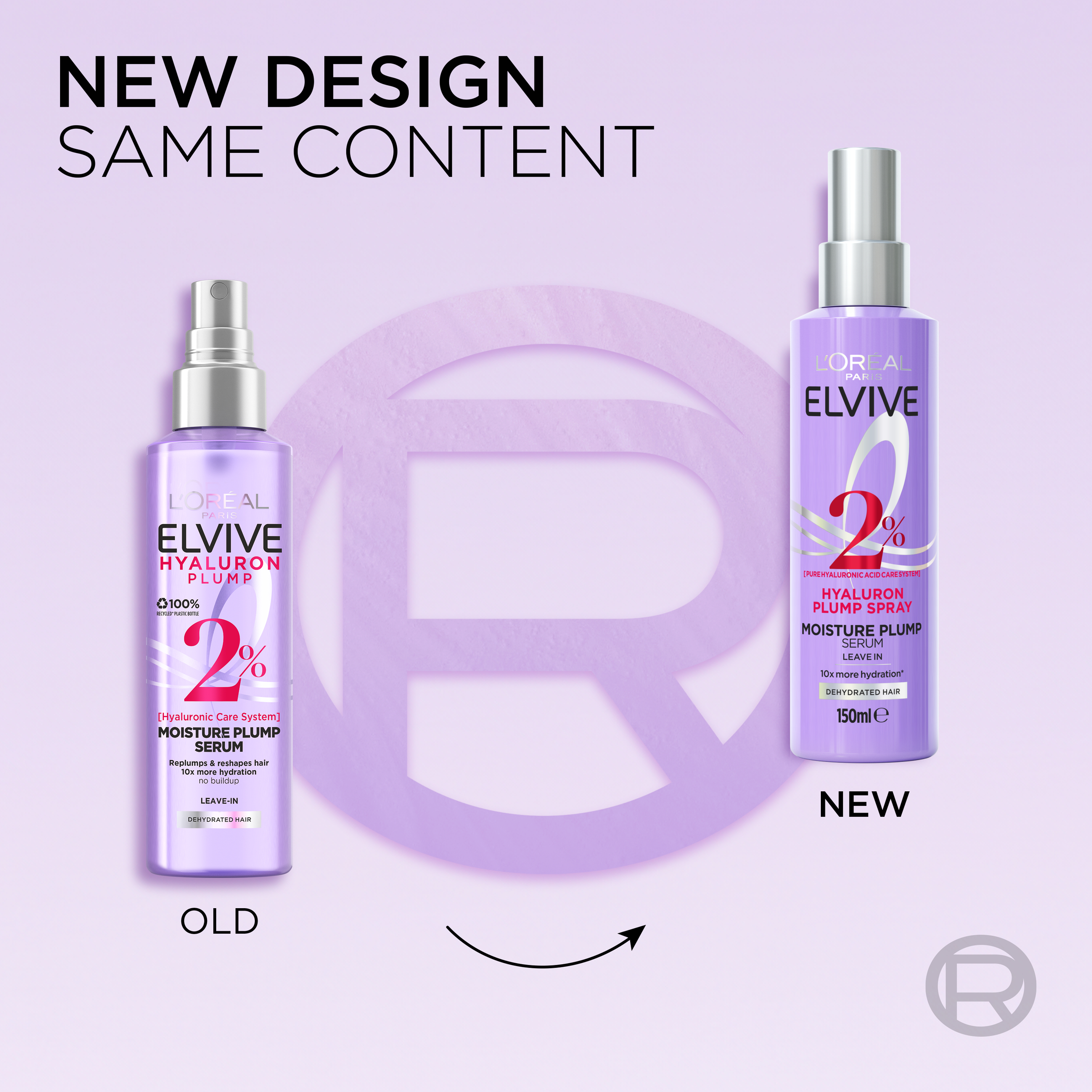 Dehydrated hair? This is caused by losing moisture. The Elvive Hyaluron Plump Spray (Moisture Plump Serum) by L'Oréal Paris powered by a 2% Hyaluronic Care System, instantly replenishes hair with moisture and increases hair thickness by 9%^ at every use. Use it as a daily moisturiser to bring 10X more hydration^ and to restyle. ^Instrumental Tests