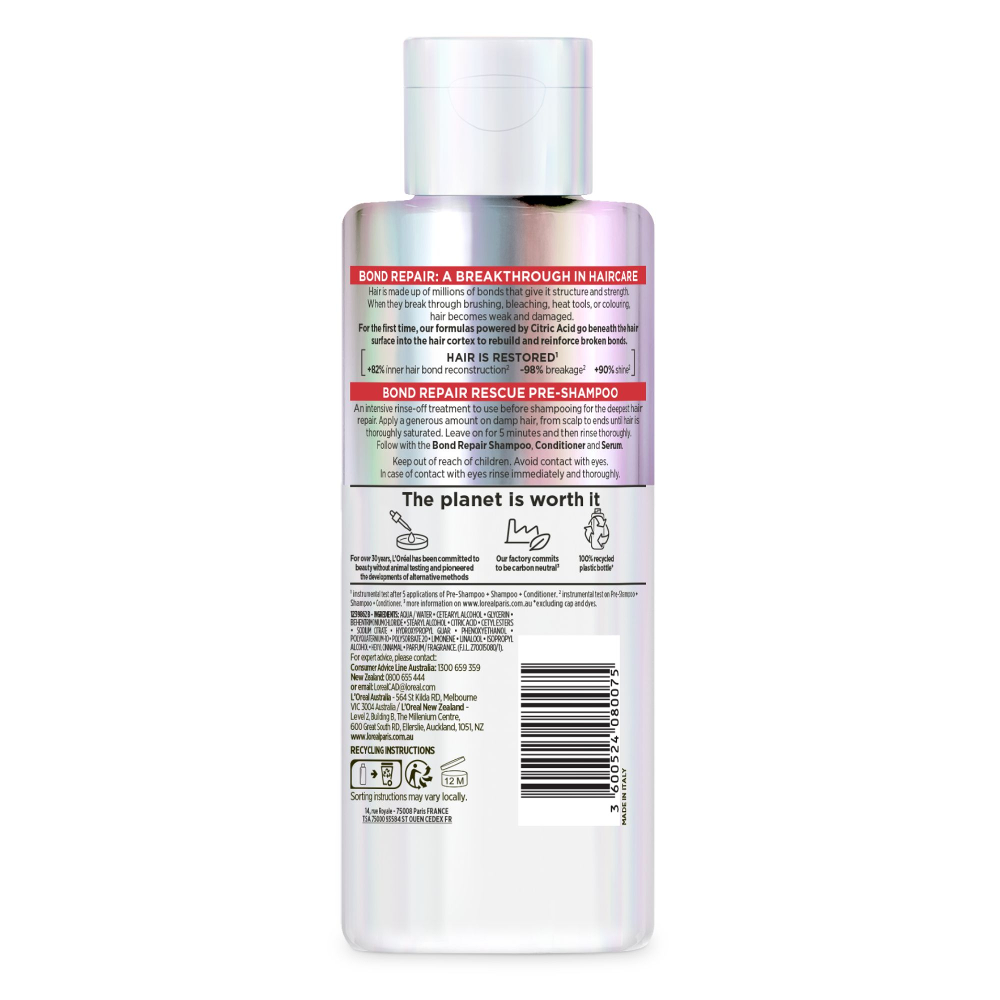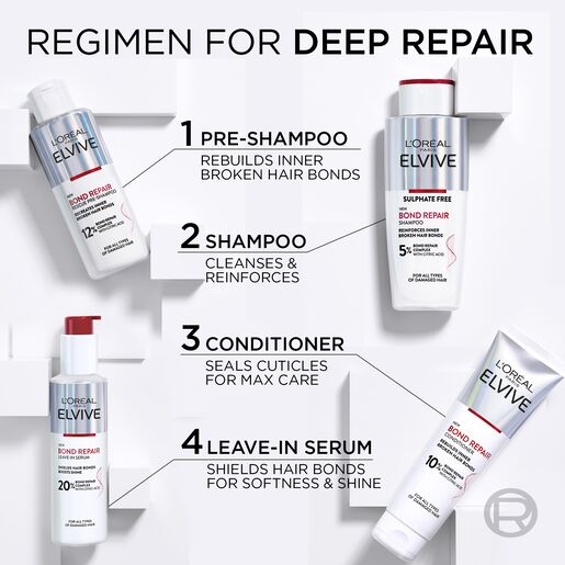 L'Oréal Paris Elvive Bond Repair Pre-Shampoo is an intensive rinse-off treatment to use before shampoo. Powered by 12% Bond Repair complex with citric acid, the treatment penetrates beneath the hair surface to rebuild inner broken hair bonds.