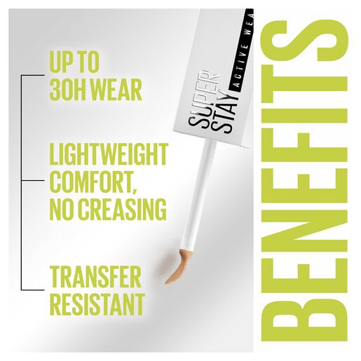 Super Stay Active Wear Concealer delivers up to 30H wear and full coverage matte that looks and feels like skin. For a dramatic transformation, use this long lasting concealer that resists transfer. Lightweight formula does not crease or feel cakey.