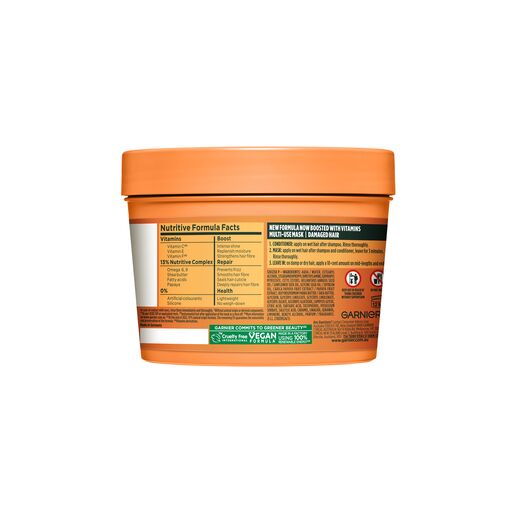 Garnier Fructis Papaya hair food multi use Mask, repairs damaged hair, 94% less breakage, Boosted with Vitamins C, E, F, 350ml, 97% natural origin ingredients, No silicone, No artificial colourants, Cruelty Free, Vegan, Made of 100% recycled plastic.