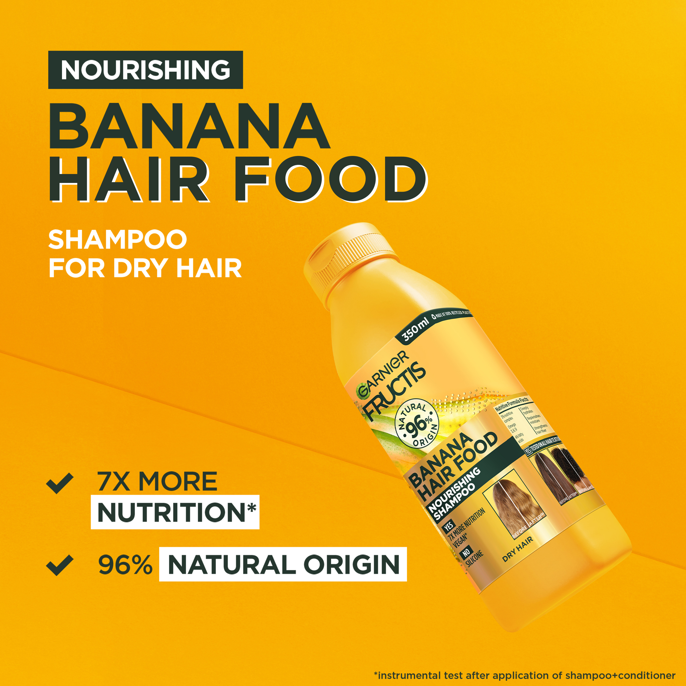 Garnier Fructis Banana Hair food Shampoo, Nourish dry hair, 7X more nutrition, first nutritional fact-based haircare, 350ml, No silicone, No artificial colourants, 96% natural origin ingredients, Cruelty Free, Vegan, Made of 100% recycled plastic