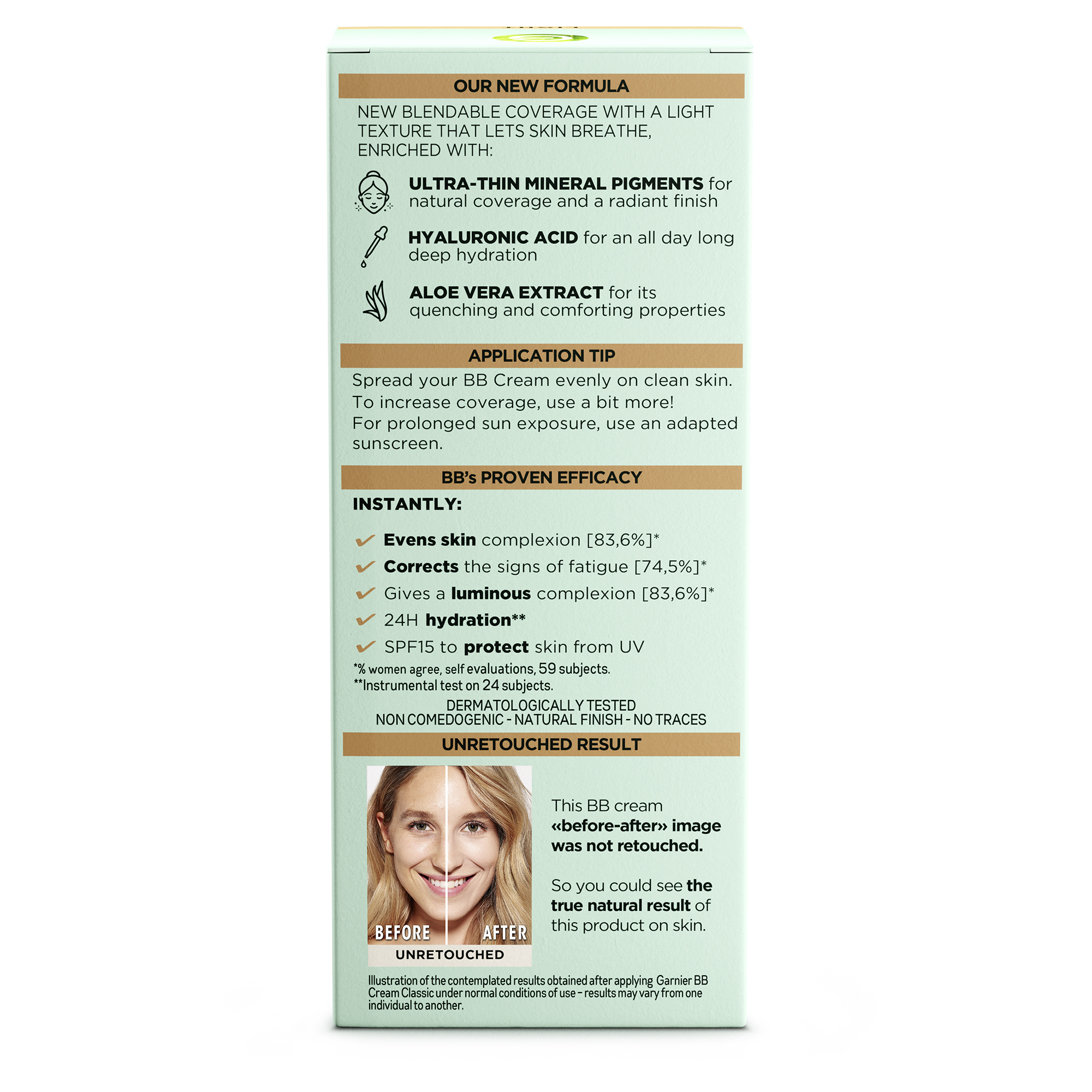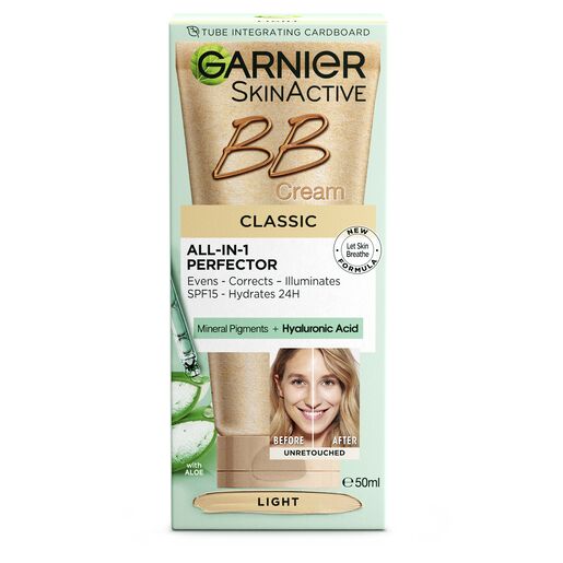 Garnier BB Cream Classic is an All-In-1 perfector that covers, evens, corrects, illuminates and protects with SPF 15 in one easy step. With a new lightweight and blendable formula enriched with Hyaluronic Acid, Aloe Vera and ultra fine mineral pigments resulting in natural looking coverage with a radiant finish.