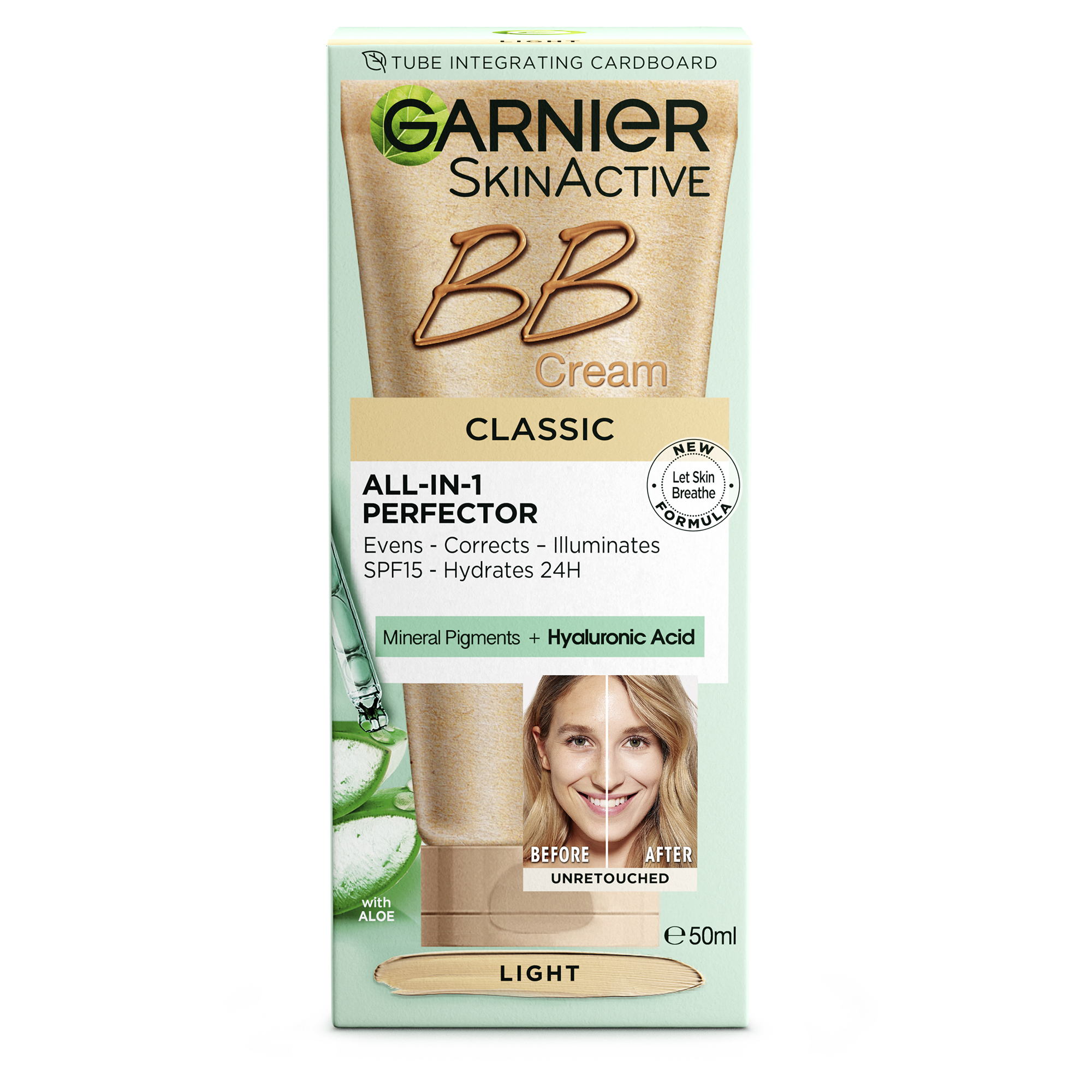 Garnier BB Cream Classic provides the benefits of using a foundation, a hydrating care and an SPF 15 all in one single step, offering natural looking coverage in a caring formula. Instantly evens skin complexion, corrects the signs of fatigue, gives a luminous glow and protects the skin with SPF 15. This all-in-1 convenient beauty solution features a new let skin breathe lightweight and blendable formula. Enriched with Hyaluronic Acid for day long hydration, Aloe Vera for its comforting properties, and ultra fine mineral pigments for radiant coverage. Garnier BB Cream is non-comedogenic and dermatologically tested. Now in an innovative more sustainable integrated cardboard tube made with 49% less plastic and 100% recyclable cardboard box that is responsibly sourced. Garnier BB Cream Classic is available in two shades: Light and Medium.