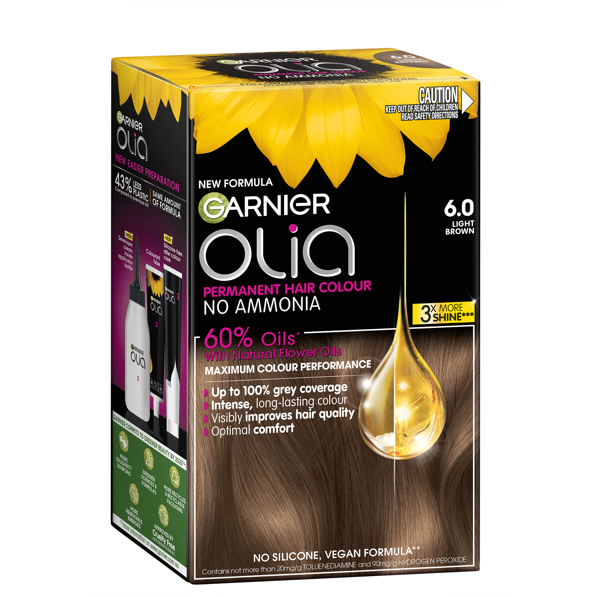 Discover Garnier Olia Permanent Hair Dye. Now with an Improved Formula with No Ammonia, No Silicone and 60% oils to propel colour deep inside the hair for maximum colour and up to 100% grey coverage.
