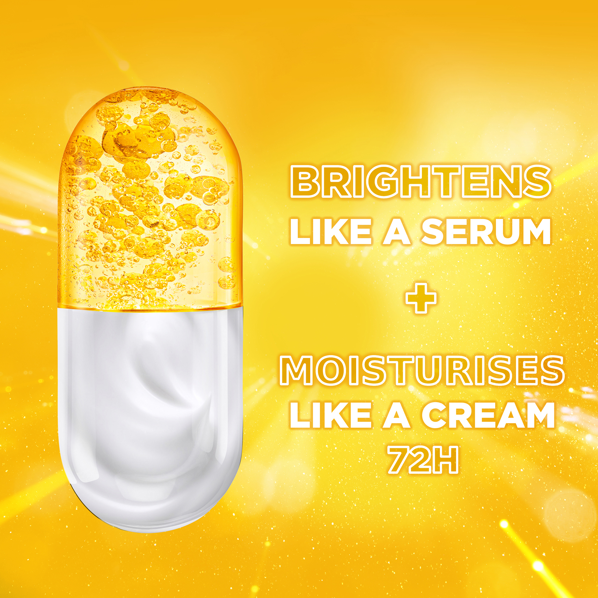 "Want even, radiant skin that glows? Our Vitamin C serum Cream combines the benefits of both a brightening serum, with lasting moisture of a cream in the SPF 15 moisturiser. Our formula is concentrated with 20% serum enriched with Vitamin C* & Super Citrus in addition to an SPF 15 moisturiser, to protect your skin from sun-induced dark spots. [VITAMIN C*] is a powerful dermatological active ingredient which helps to boost glow and enhance skin radiance, while [SUPER CITRUS], a natural renewable extract, is well known for its brightening properties. Creamy yet lightweight, fast-absorbing, and oil-free. Get a healthy glow in just 3 days: 72% of women noticed their skin was less dull**. Scientifically proven to reduce dark spots visibility, signs of tiredness and improve eveness. *Vitamin Cg. **Self-assessments on 144 people. "