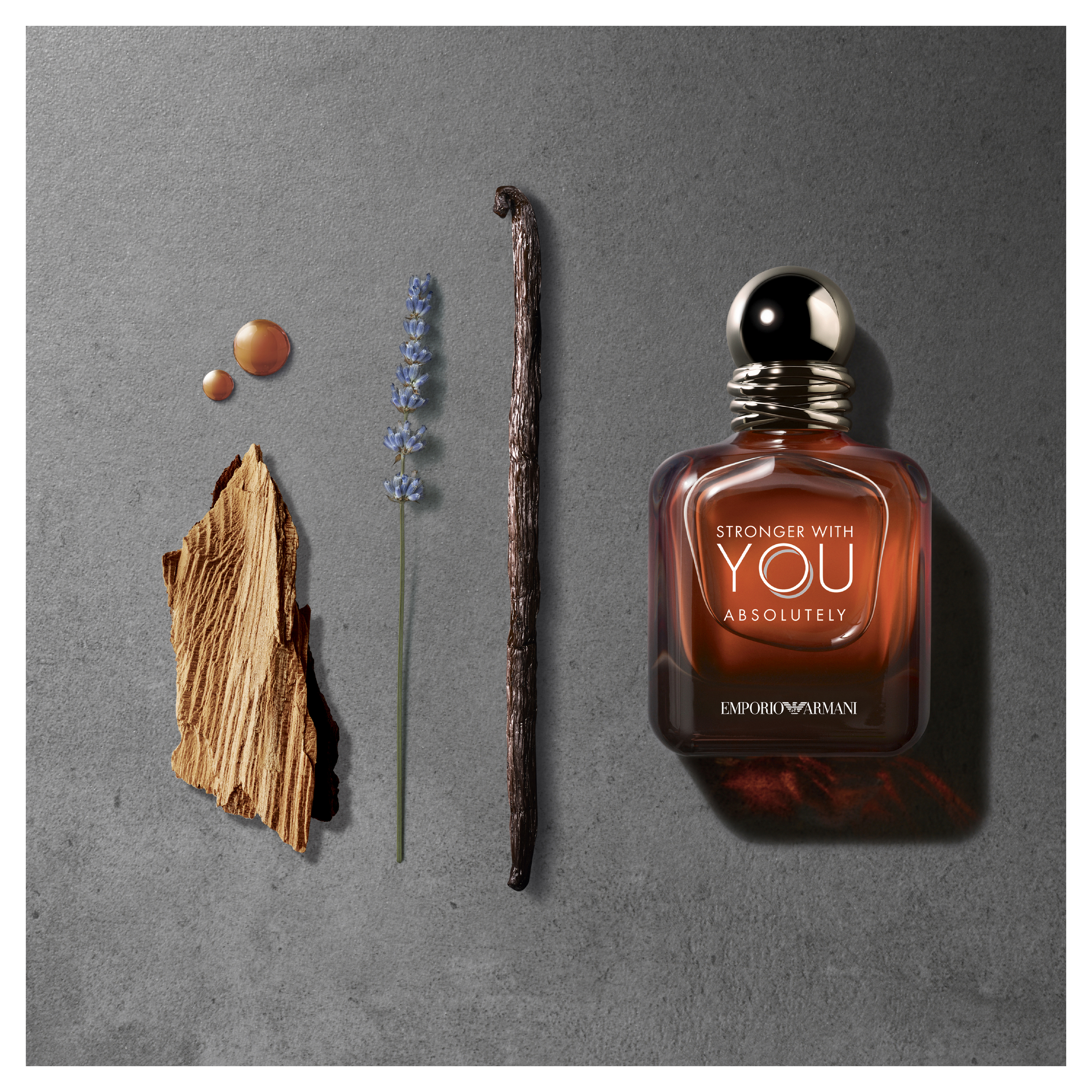 Stronger With You Absolutely parfum is an addictive fragrance for men, inspired by the power of absolute love. This powerful and sensual fragrance is boosted by an addictive new rum accord, while lavender, sustainably sourced in France, is irresistibly enhanced with liquorous and fruity facets. Warm vanilla, harvested in Madagascar while supporting local communities, and smoky cedar wood, carefully extracted in Virginia, USA, round up this powerful scent. Stronger With You Absolutely is enveloped by an intense smoky lacquering that conveys the absolute strength of the parfum. NOTES: With Stronger With You Absolutely, Emporio Armani introduced a new powerful Fougere Ambery Oriental scent. RUM ACCORD The signature of glazed chestnut is boosted by an addictive new rum accord. LAVENDER Lavender, sustainably sourced in France, is enhanced with liquorous and fruity facets. VANILLA & CEDAR WOOD Smoky cedar wood, carefully exctracted in Virginia, USA, and addictive vanilla, harvested in Madagascar while supporting local communities, round up this powerful and intoxicating scent.