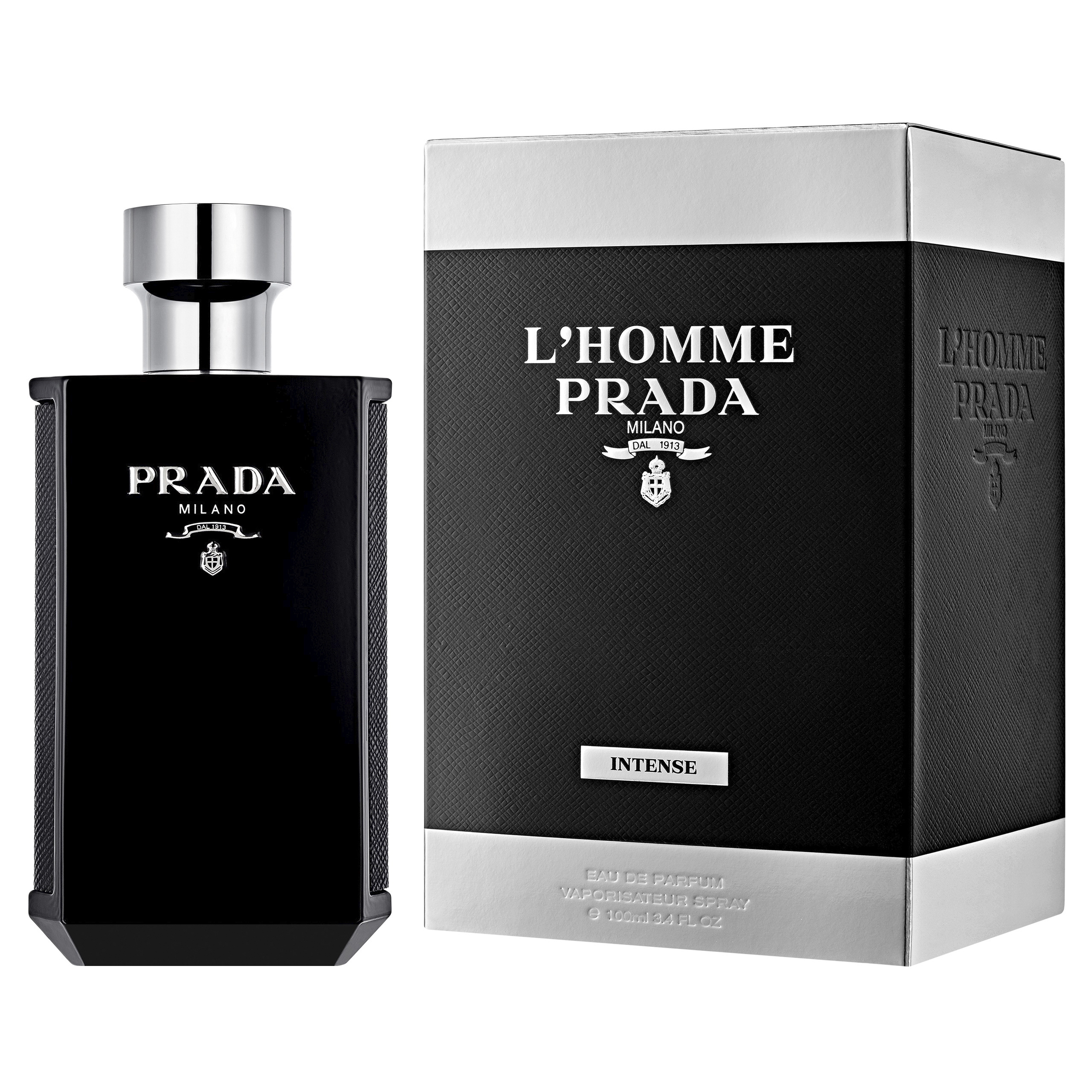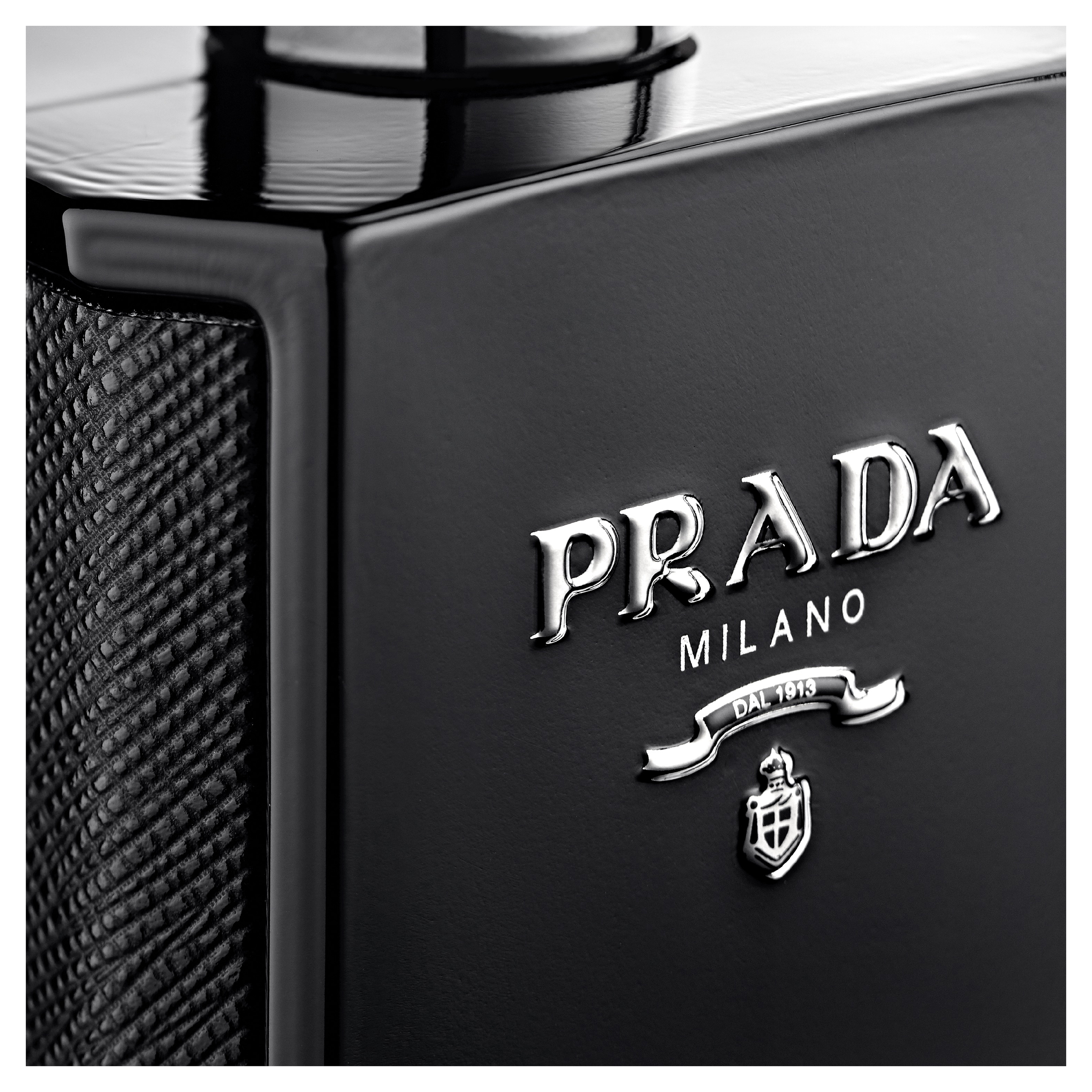 L’Homme Prada Intense Eau de toilette is a sensual fragrance, a woody ambery scent blending warm cardamom, vigorous patchouli and addictive amber accord. L’Homme Prada Intense is a powerful scent for a charismatic and determined man. The perfume bottle is wrapped in iconic black Prada Saffiano. The original Prada logo appears raised in silver on the front of the black lacquered bottle.