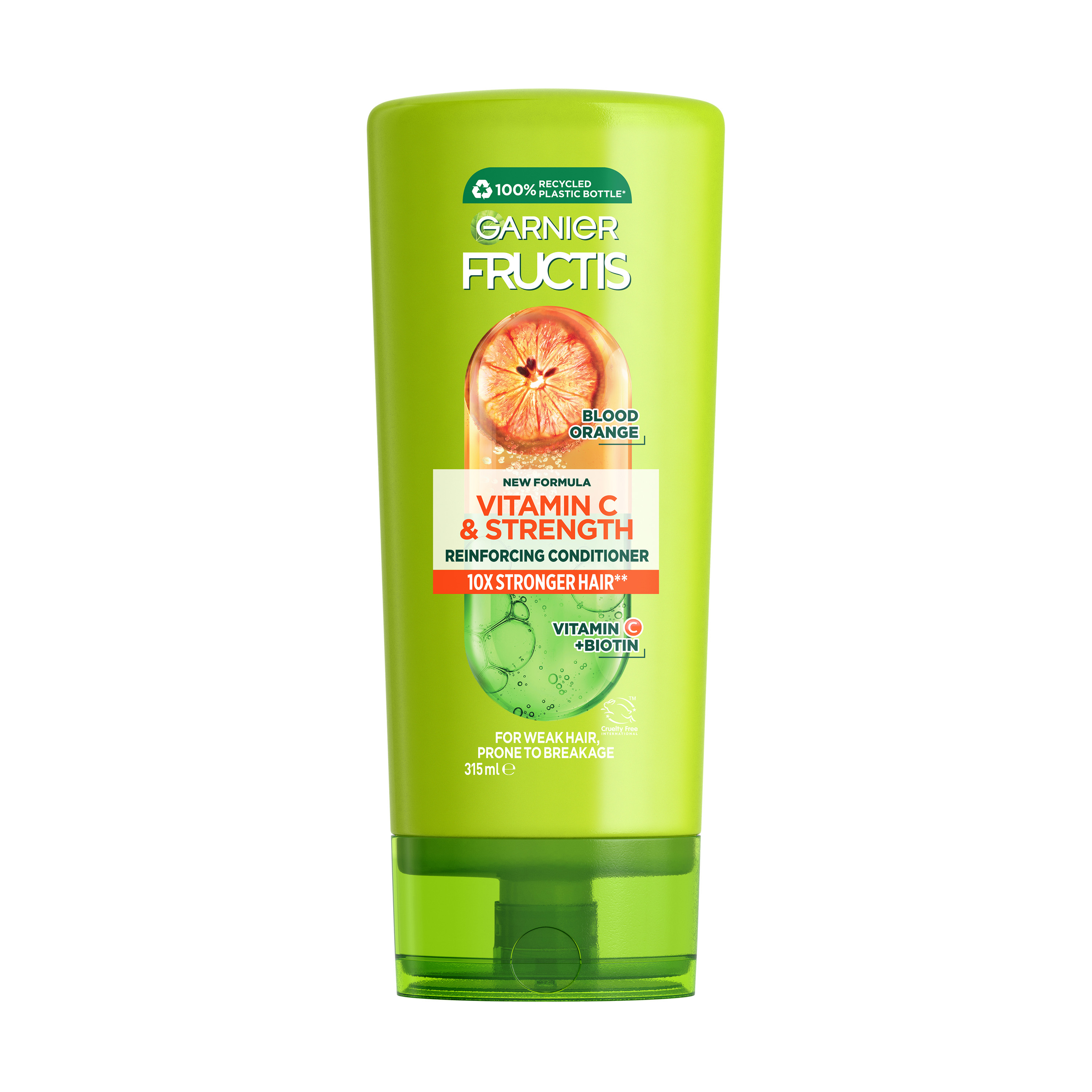 WEAK HAIR, PRONE TO BREAKAGE? Discover your daily dose of vitamin-enriched conditioner for 10x stronger* hair from roots to tips and reduce hair-fall due to breakage. Our conditioner is powered by a super duo of ingredients, a natural origin superfruit andpowerful scientific actives: • Blood orange, one of the fruit the mostconcentrated in vitamins, to fortify hair fiber; • A multivitamins complex, Vitamin C derivative and Biotin, to strengthen hair from roots to tips. It’s proven! Hair is visibly healthier and stronger. Vitamin & Strength conditioner is: VEGAN FORMULA** DERMATOLOGICALLY TESTED PH NEUTRAL FOR THE SCALP MORE SUSTAINABLE PACKAGING: Garnier fructis shampoo & conditioner bottles are made from 100% recycled plastic^ and can be recycled. GARNIER COMMITS TO GREENER BEAUTY BY 2025: More solidarity sourcing Greener Science & Formulas More recycled & recyclable packaging More renewable engery Garnier is approved by Crueltry Free international under the Leaping Bunny Programme *instrumental test, shampoo + conditioner. **no animal derived ingredients ^except label, additives and cap.