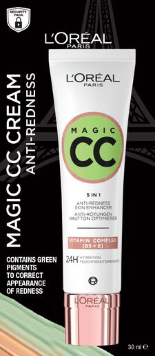 Perfect your skin with L'Oreal Paris Magic CC cream, now formulated with Vitamin B5 and Vitamin E. This CC Cream contains mineral pigments with green tone to help correct the appearance of redness in the skin. With a lightweight formula that adapts to your skin tone for a flawless finish. Providing up to 24 hours of hydration, Magic CC cream provides a natural make-up result all day long, visibly reduces redness. Skin looks smother and is instantly glowing. This 5in1 transforming skin perfector works to • Reduces the appearance redness • Hydrates • Smooths • Brightens • Helps protect skin against external aggressors