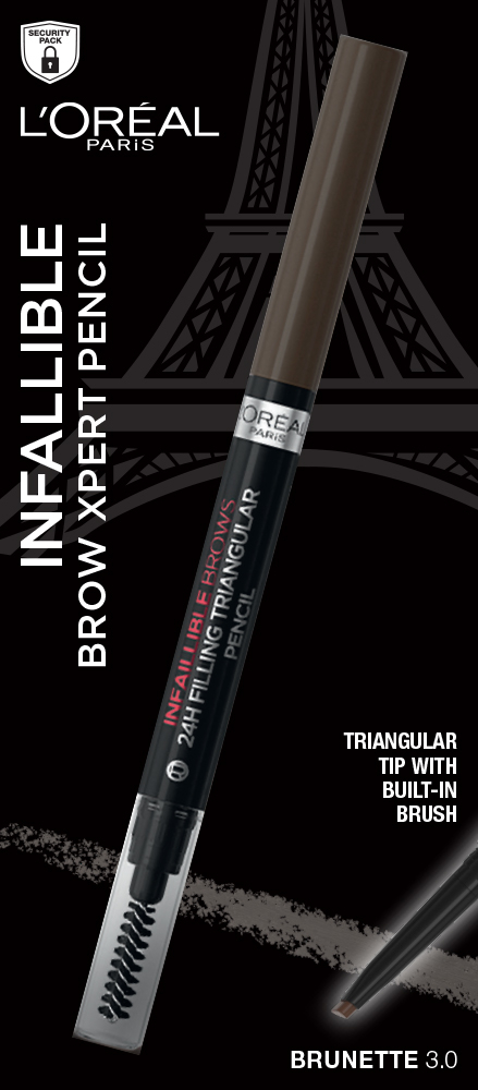 The Infallible 24H Filling Triangular Pencil by L'Oreal Paris helps you get flawless, natural looking eyebrows. - The formula fills the brows while resulting in a natural matte finish - The pencil's triangular tip defines and fills the eyebrows - The built-in brush creates the perfect eyebrow shape